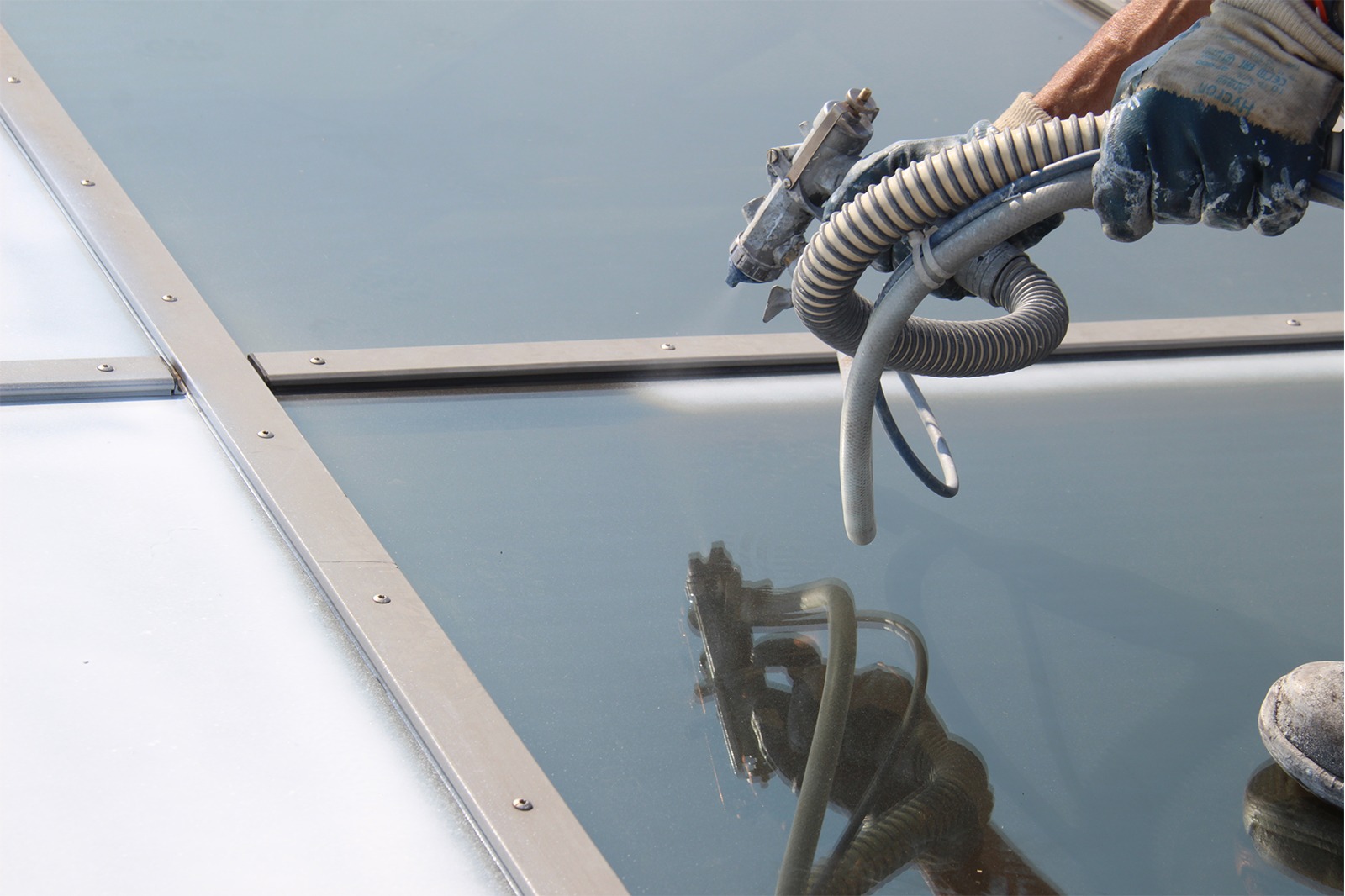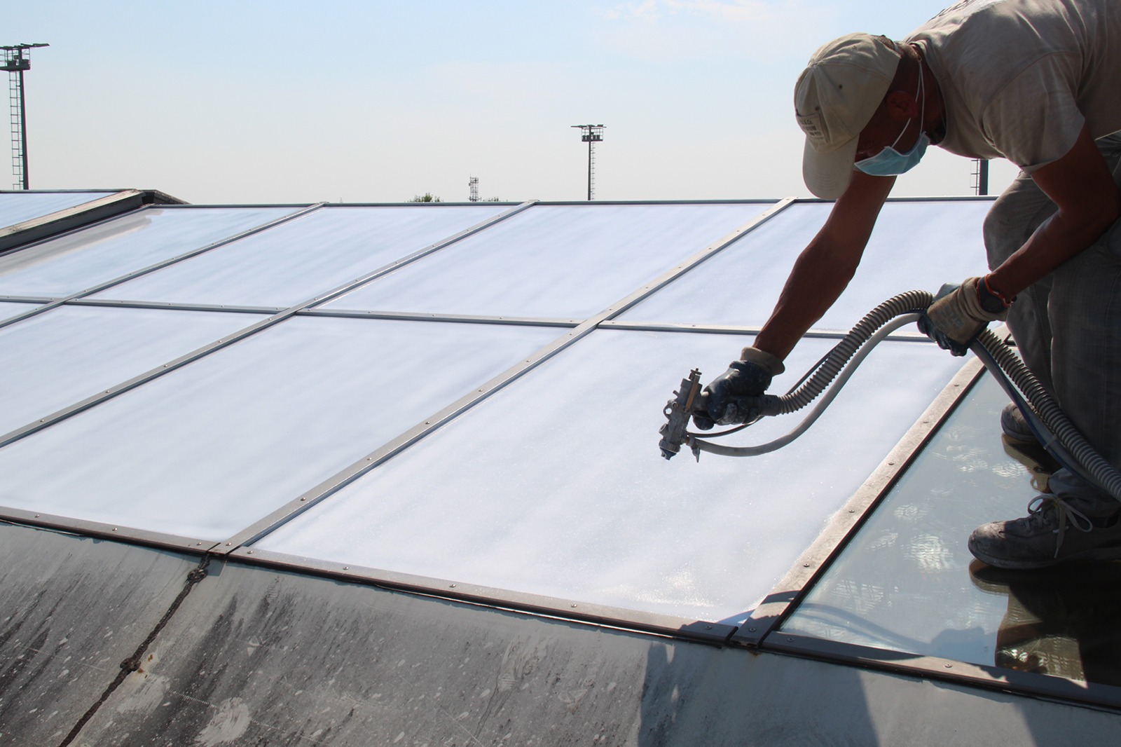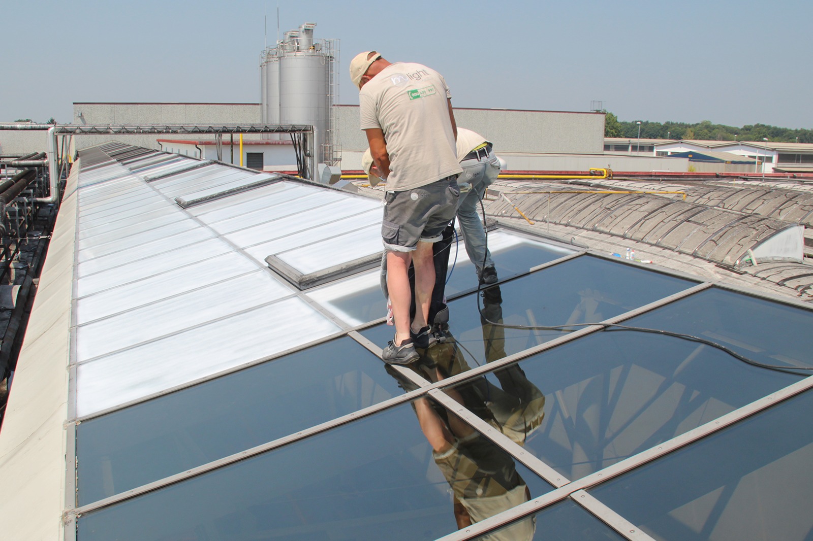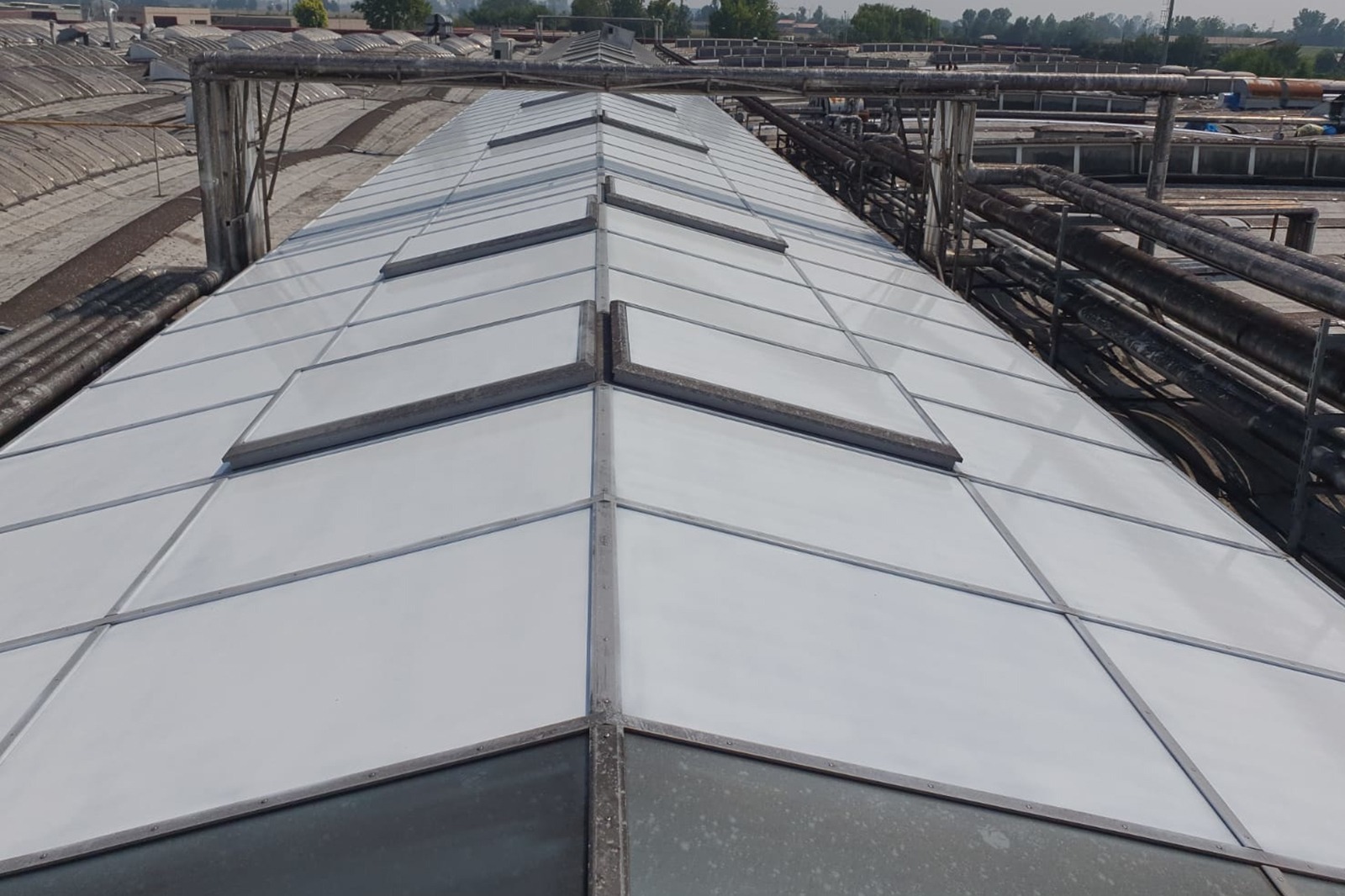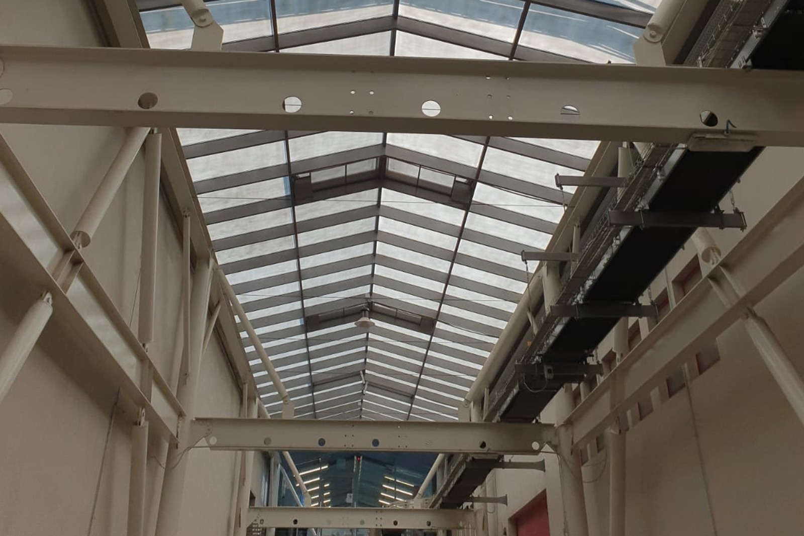 Il collegamento fra i capannoni era stato realizzato con una grande struttura in vetro non climatizzata che nella stagione estiva diventava un vero e proprio forno. Dopo il nostro intervento con la Vernice per Vetro, le temperature si sono abbassate garantendo la vivibilità di questi spazi.